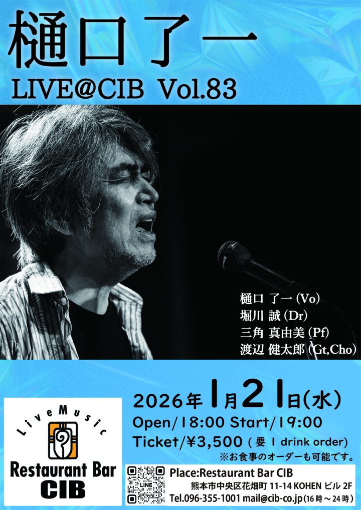 人気テレビ番組「水曜どうでしょう」のテーマソング「1/6の夢旅人2002」や、第51回日本レコード大賞 優秀作品賞を受賞した「手紙〜親愛なる子供たちへ〜」などのヒット曲を生み出し、SMAP、中島美嘉、郷ひろみ、石川さゆりへの楽曲提供も多数手掛けコンポーザーとしても活躍、映画「いまダンスをするのは誰だ?」で主演を努めた熊本出身のシンガーソングライター樋口了一のCIB定例ライブ!