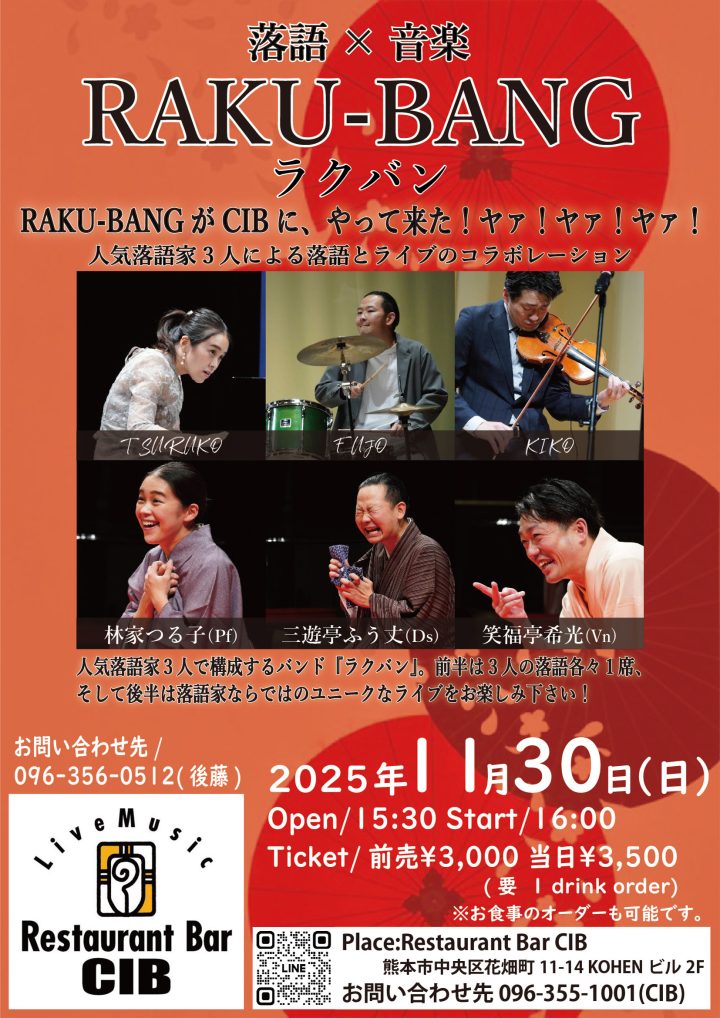 落語と音楽のコラボレーション、「RAKU-BANG」の全国ツアーが熊本CIBにて開催! 3人の落語家による落語三席とバンドライブは必見です! 林家つる子 三遊亭ふう丈 笑福亭希光 お問い合わせ先/