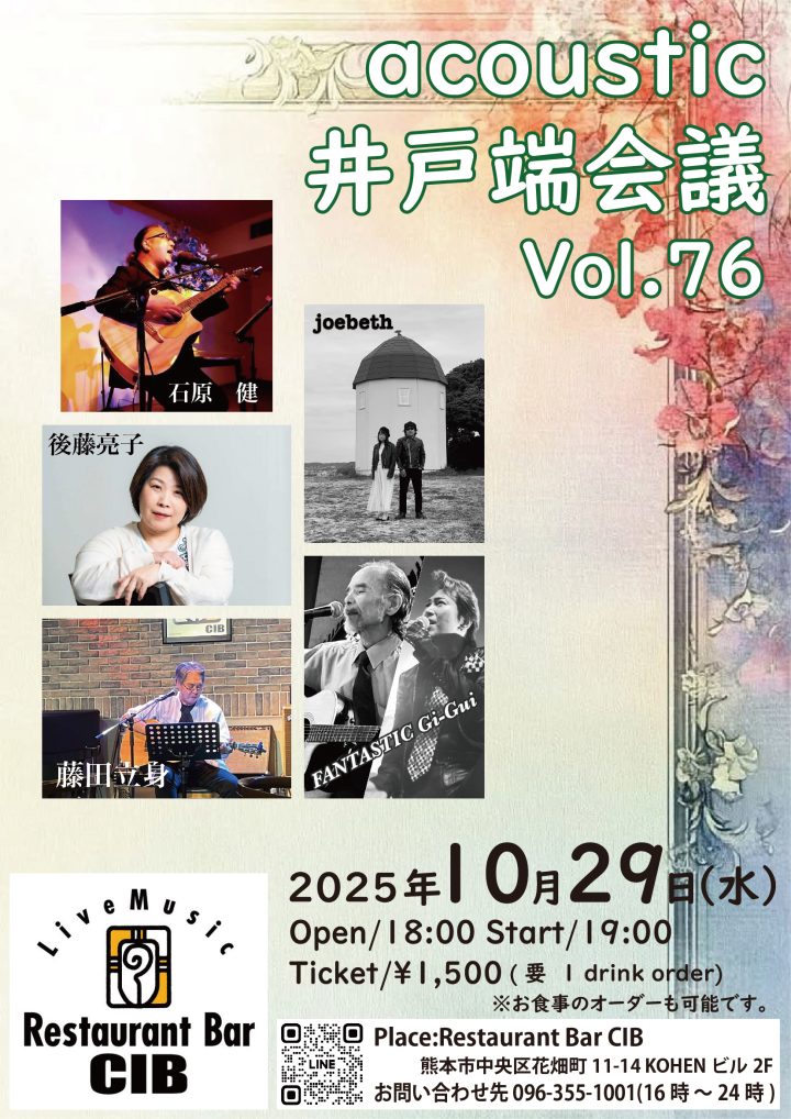 今回で76回目を迎えるacoustic井戸端会議! 個性豊かなアーティスト達による熱いライブをぜひ会場でお楽しみ下さい! 出演アーティスト(順不同) 藤田立身 石原健 後藤亮子 FANTASTIC g
