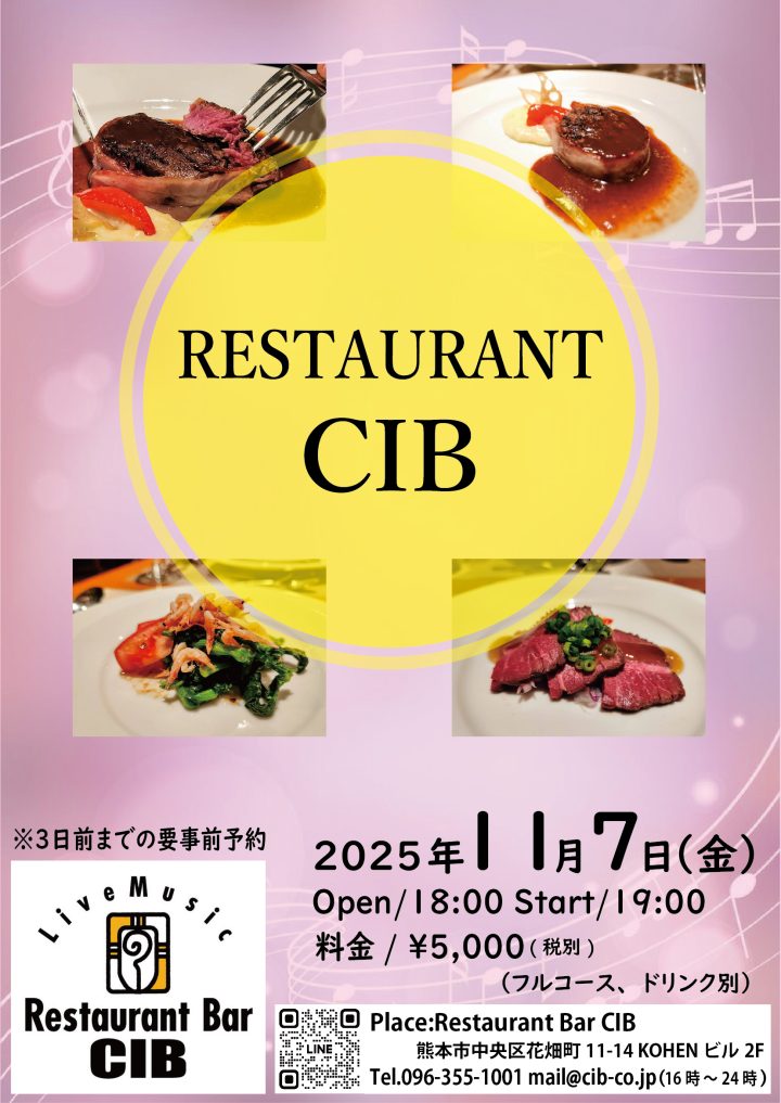 普段はイタリアンを中心としたお料理を提供しているRestaurant Bar CIBですが、この日だけはシェフが腕を振るいこの日にしか食べられないフルコース料理をご提供致します! ジャズの生ピアノ