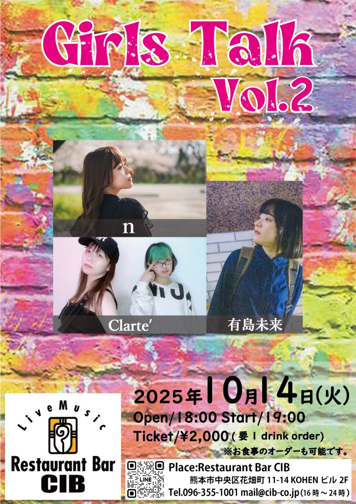 CIBに新しく誕生した女性アーティスト応援イベント「Girls Talk」 第2回目は熊本、福岡を拠点に活躍する3組のアーティストが出演致します。ぜひ会場で彼女たちのパフォーマンスをお楽しみ下さい!